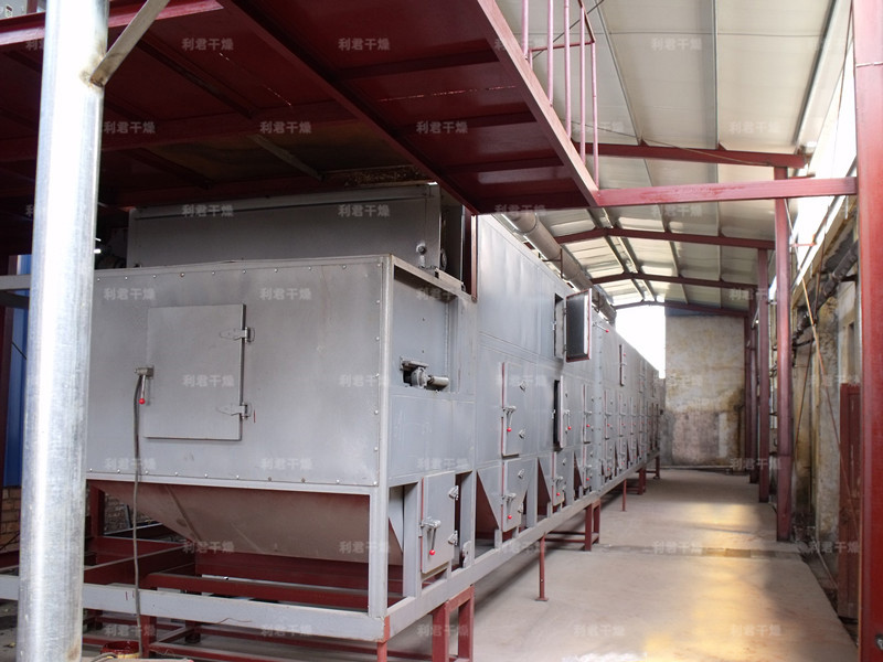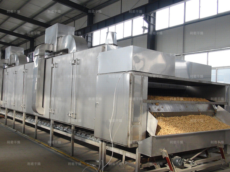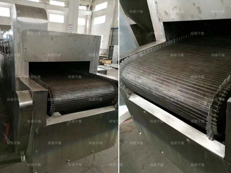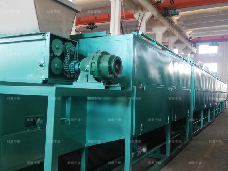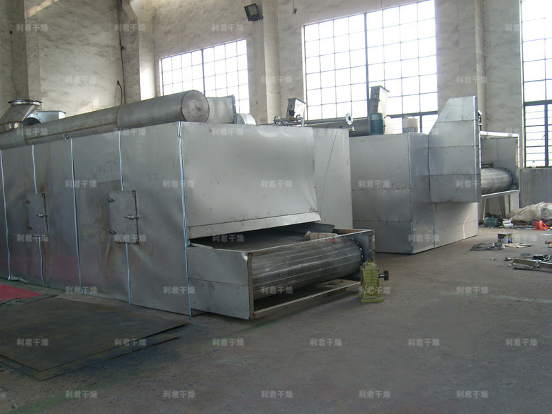 物料由加料器均勻地鋪在網(wǎng)帶上,網(wǎng)帶一般采用12-60目不銹鋼絲網(wǎng),由傳動裝置拖動在干燥機(jī)內(nèi)移動。干燥機(jī)由若干單元組成,每一單元熱風(fēng)獨立循環(huán),部分尾氣由專門排濕風(fēng)機(jī)排出,廢氣由調(diào)節(jié)閥控制,熱氣由下往上或由上往下穿過鋪滿物料的網(wǎng)帶完成熱量與質(zhì)量傳遞的進(jìn)程,帶走物料水份。網(wǎng)帶緩慢移動,運行速度可根據(jù)物料溫度自由調(diào)節(jié),干燥后的成品連續(xù)落入收料器中。上下循環(huán)單元根據(jù)用戶需要可靈活配備,單元數(shù)量亦可根據(jù)需要選取。