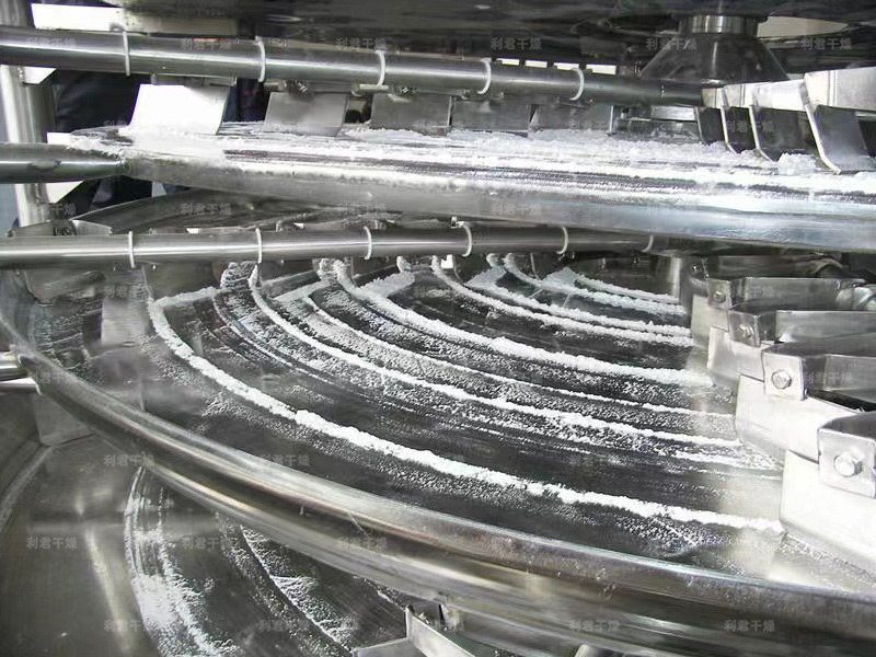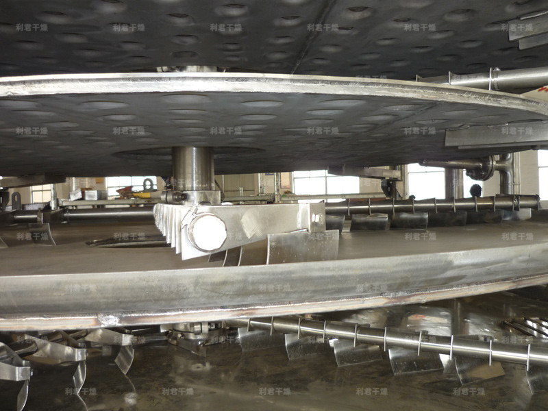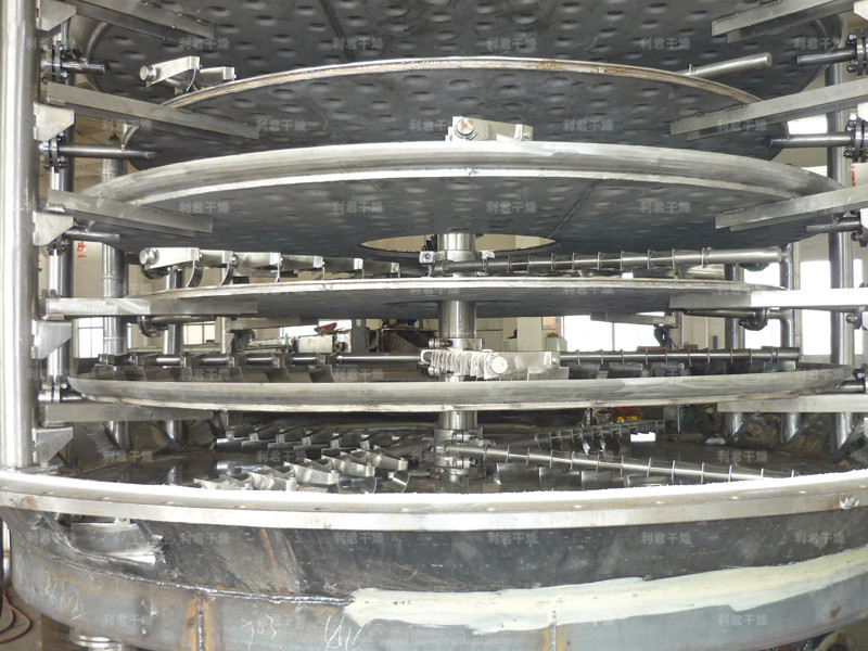 濕物料自加料器連續(xù)地加到干燥器上部第一層干燥盤上,帶有耙葉的耙臂作回轉運動使耙臂作回轉運動使耙葉連續(xù)地翻抄物料。物料沿指數(shù)螺旋線流過干燥盤表面,在小干燥盤上的物料被移送到外緣,并在外緣落到下方的大干燥盤外緣,在大干盤上物料向里移動并從中間落料口落如下一層小干燥盤中。大小干燥盤上下交替排列,物料得以連續(xù)地流過整個干燥器。中空的干燥盤內(nèi)通入加熱介質(zhì),加熱介質(zhì)形式有飽和蒸汽、熱水和導熱油,加熱介質(zhì)由干燥盤的一端進入,從另一端導出。已干物料從最后一層干燥盤落到殼體的底層,最后被耙葉移送到出料口排出。濕份從物料中逸出,由設在頂蓋上的排濕口排出,真空型盤式干燥器的濕氣由設在頂蓋上的真空泵口排出。從底層排出的干物料可直接包裝。通過配加翅片加熱器、溶劑回收冷凝器、袋式除塵器、干料返混機構、引風機等輔機,可提高其干燥的生產(chǎn)能力,干燥膏糊狀和熱敏性物 料,可方便地回收溶劑,并能進行熱解和反應操作。
