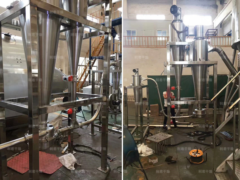 該機(jī)采用全封閉形式,所有部件均采用不銹鋼制造,配有三級(jí)凈化裝置,過濾后的空氣達(dá)十萬級(jí)要求。筒體與頂部裝有冷壁裝置,使壁溫<80℃,干燥塔內(nèi)裝有氣刷掃塔裝置。經(jīng)該機(jī)干燥后的中藥浸膏粉,不會(huì)出現(xiàn)焦化變質(zhì)現(xiàn)象,大大增加了收粉率(95%以上),而且不會(huì)產(chǎn)生混藥現(xiàn)象和粘壁現(xiàn)象。